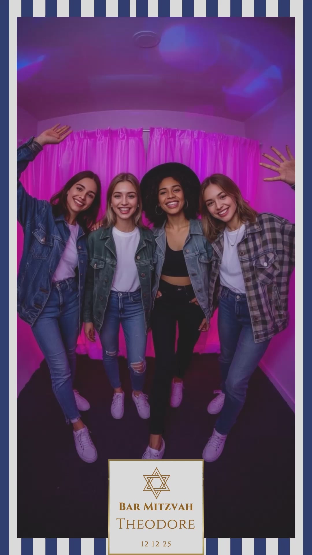 Elevate your celebration with the elegant Blue Stripe Bar Mitzvah 360 Video Booth Overlay. This classic template provides a sophisticated, framed look for slow-motion video captures of this momentous occasion.