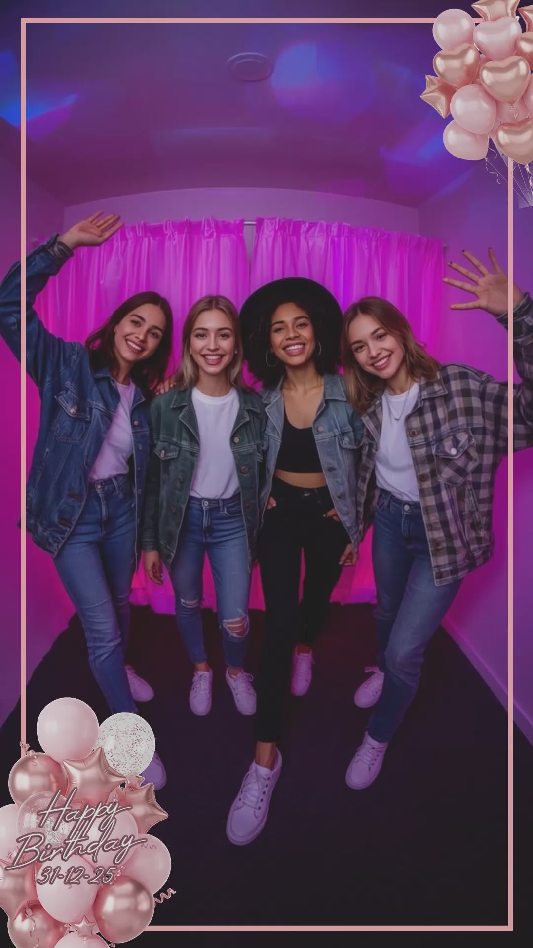 This high-quality digital download features shimmering rose gold and pink balloons framing the video, along with a subtle "Happy Birthday" graphic, ready for customization.