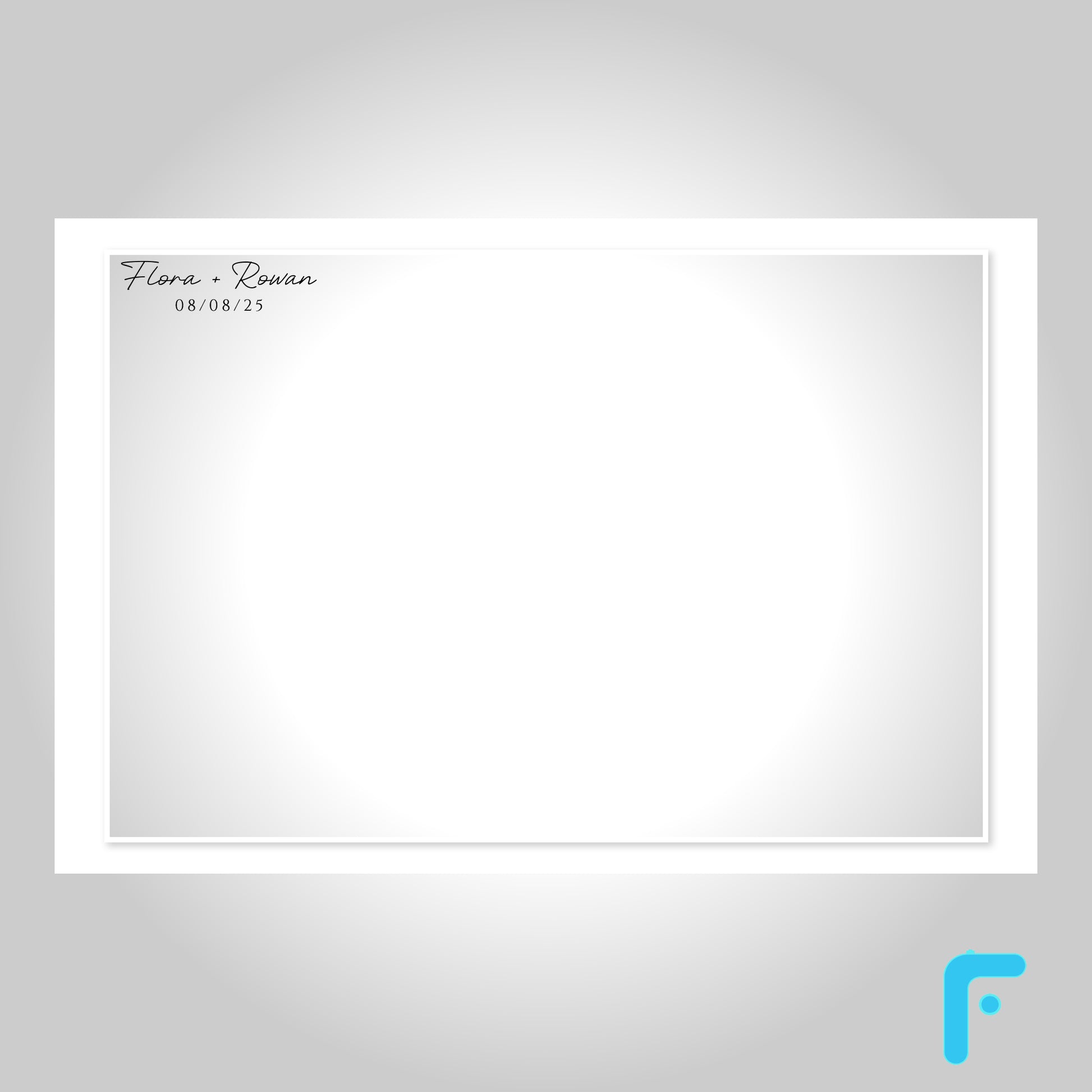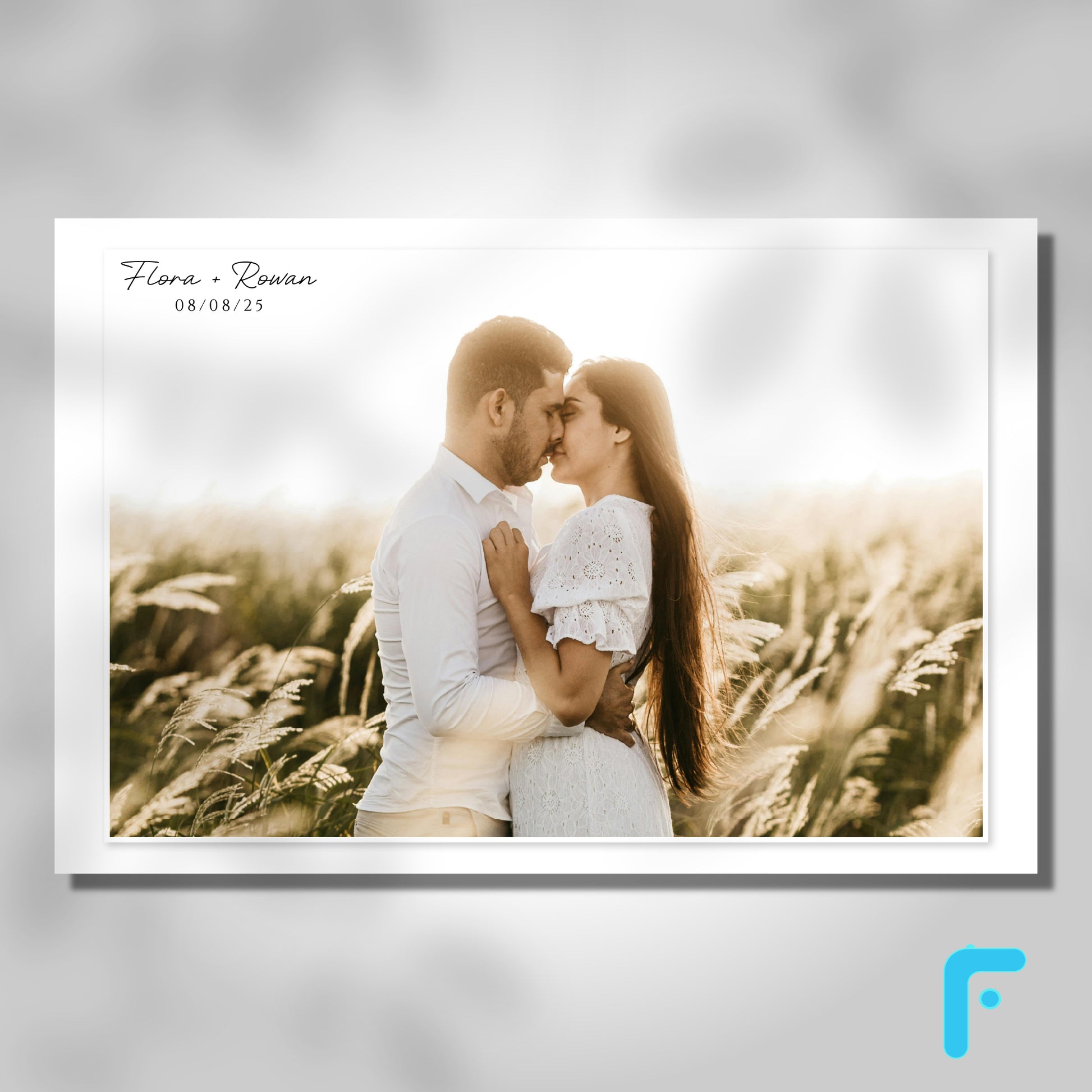This high-quality digital download features a crisp white background, allowing your photos to pop, complemented by elegant black script for the couple's names and wedding date (e.g., Flora + Rowan 08/08/25). Its clean lines and classic typography ensure a sophisticated look.