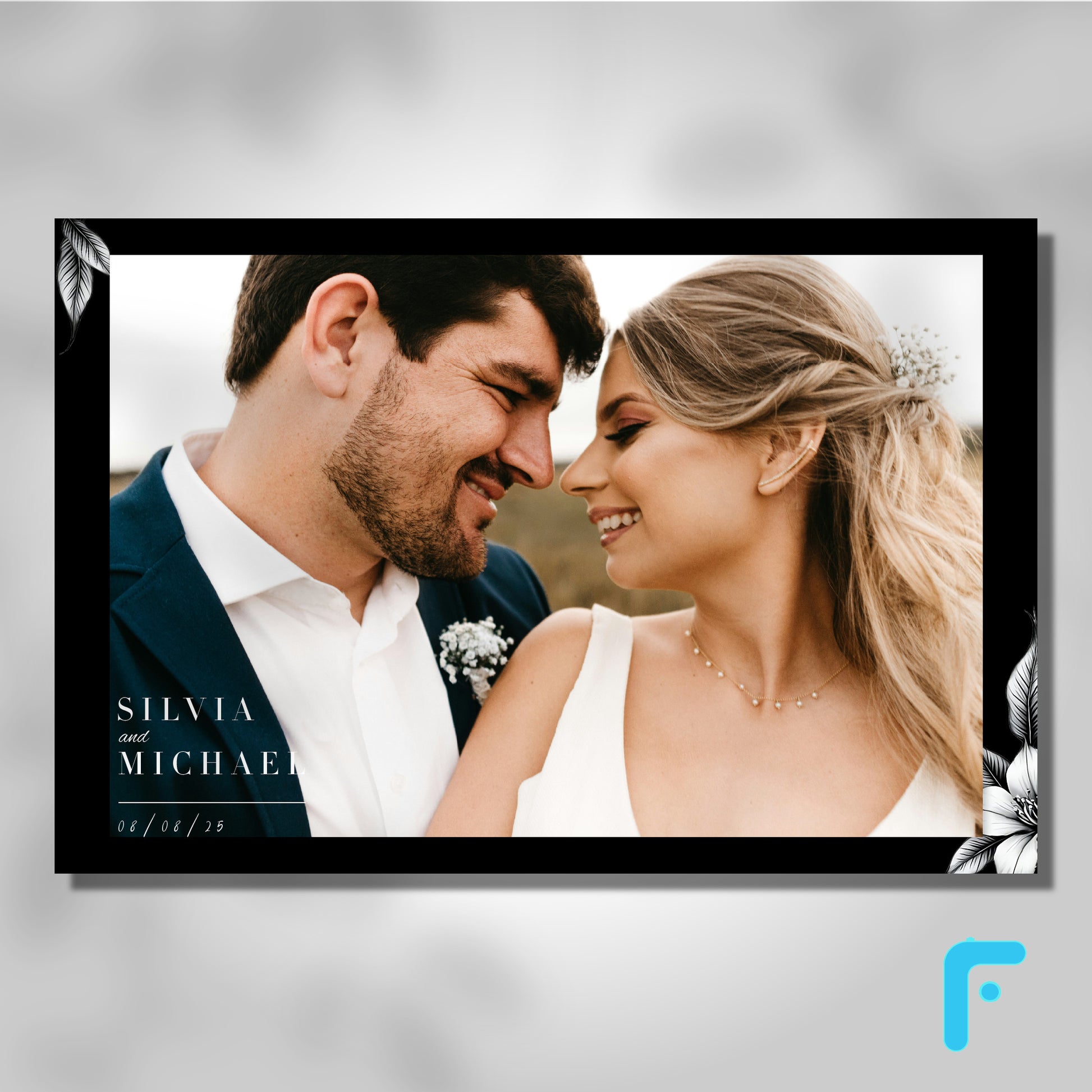 This high-quality digital download features a striking black background adorned with exquisite white and grey floral illustrations and delicate leaf accents. The minimalist yet luxurious design highlights the couple's names (e.g., Silvia and Michael) and wedding date (e.g., 08 / 08 / 25) with elegant typography, creating a truly memorable keepsake.